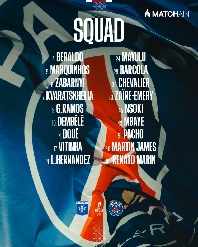 前锋:7-克瓦拉茨赫利亚、 9-贡萨洛·拉莫斯、10-登贝莱、14-杜埃、29-巴尔科拉、49-姆巴耶