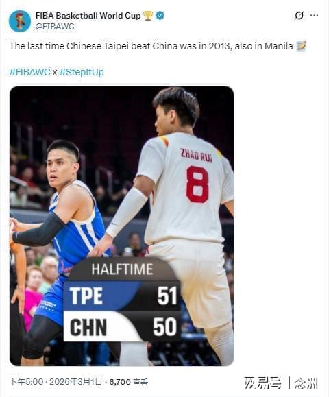 本场比赛,中国男篮上半场50-51落后中国台北,FIBA世界杯官方账号已经蠢蠢欲动,列出上一次中国台北击败中国男篮的历史:2013年,也是在马尼拉!
